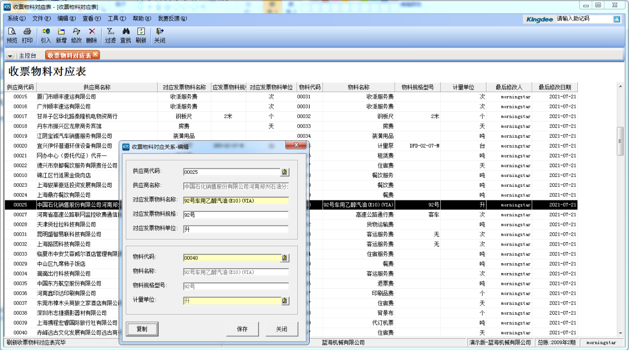 △ 收票物料對(duì)應(yīng)表界面