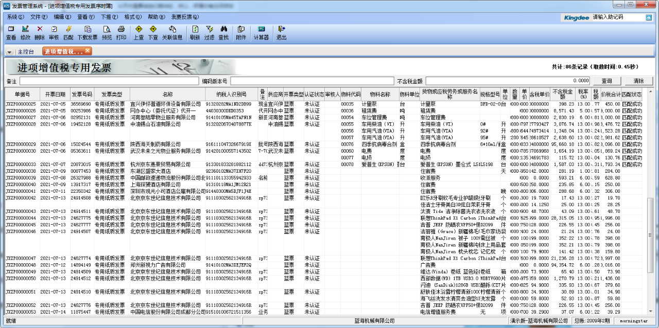 如果完成了前面兩個(gè)步驟,用戶就可以進(jìn)入「進(jìn)項(xiàng)增值稅發(fā)票」界面下載發(fā)票,一鍵匹配供應(yīng)商、物料、計(jì)量單位等信息,下推即可生成外購入庫單、采購發(fā)票單據(jù)。