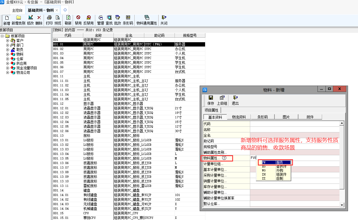 1、物料屬性增加“服務(wù)”,支持服務(wù)性質(zhì)商品的銷(xiāo)售、收款場(chǎng)景