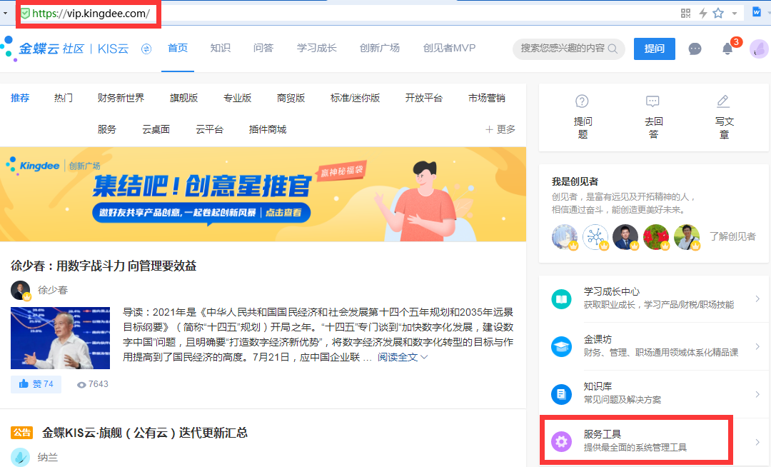 1、打開vip.kingdee.com,點(diǎn)擊右下角的【服務(wù)工具】