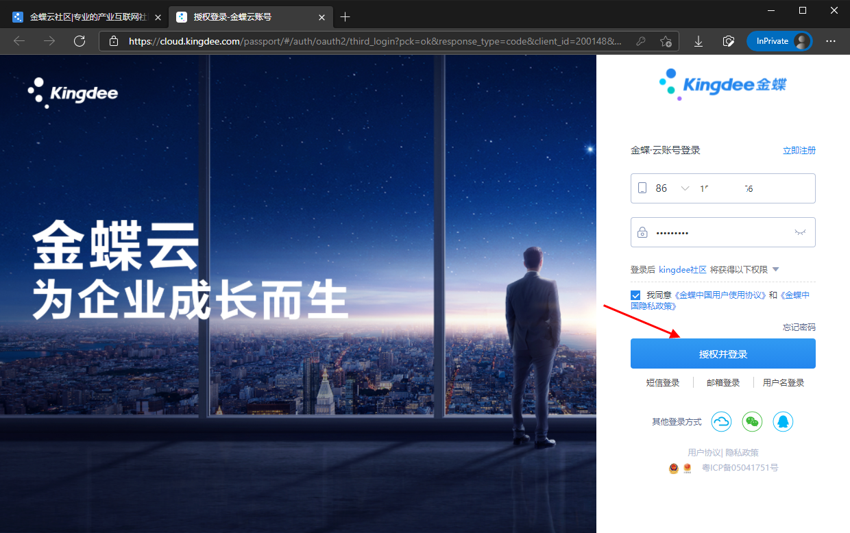 2、使用金蝶云賬號(hào)授權(quán)并登錄