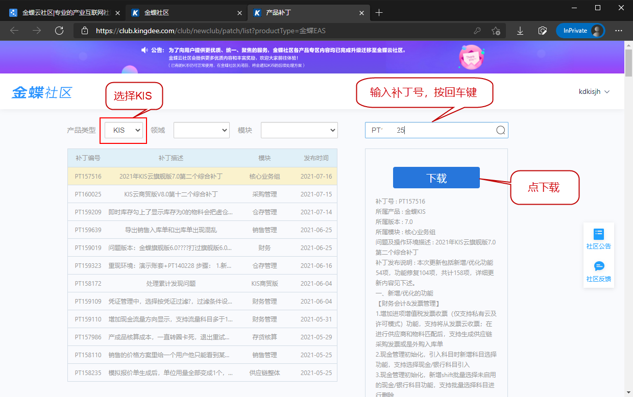 洛陽金蝶軟件,溫馨提醒,金蝶KIS產(chǎn)品補(bǔ)丁下載指引 ,進(jìn)vip.kingdee.com ,登錄金蝶云賬號(hào),選擇金蝶補(bǔ)丁下載,選擇金蝶對(duì)應(yīng)產(chǎn)品版本 補(bǔ)丁號(hào)下載,具體操作如下圖: