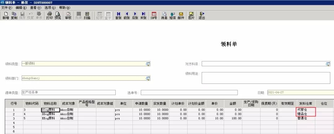 與入庫(kù)業(yè)務(wù)一樣,用戶(hù)也能根據(jù)單據(jù)分錄的倉(cāng)庫(kù)屬性,將廢品、贈(zèng)品、客供料類(lèi)物料直接與正常物料一起執(zhí)行出庫(kù)流程,并在同一單據(jù)上高效處理虛實(shí)倉(cāng)的出入庫(kù)業(yè)務(wù)。
