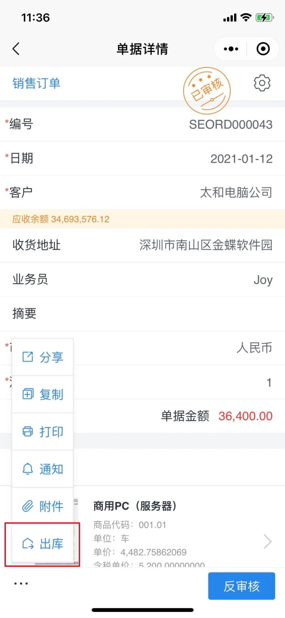 現(xiàn)在,銷售訂單審查后,倉庫管理員只需要一部手機(jī),就可以隨時隨地登錄金蝶KIS云小程序,通過銷售查詢進(jìn)入文件詳細(xì)的界面,點擊出庫按鈕快速推進(jìn)銷售訂單(購買訂單相同)