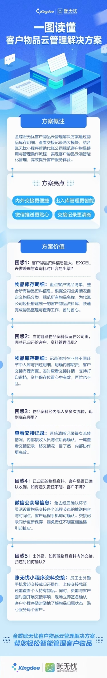 大家好,這里是“洛陽金蝶軟件”,洛陽驍智軟件科技有限公司,金蝶軟件授權(quán)“金牌”合作伙伴,金蝶賬無憂推出 客戶物品云管理解決方案,如下: