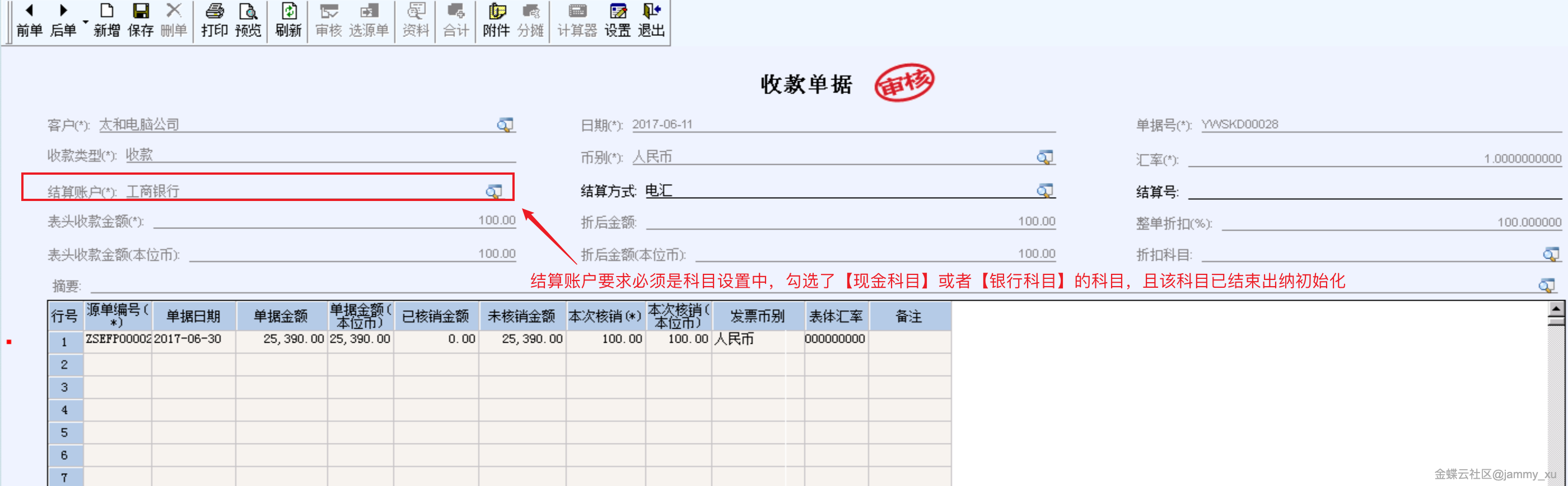 注意:收款單結(jié)算賬戶中對應(yīng)的科目,要求必須是科目設(shè)置中,勾選了【現(xiàn)金科目】或者【銀行科目】的科目,且該科目已結(jié)束出納初始化。
