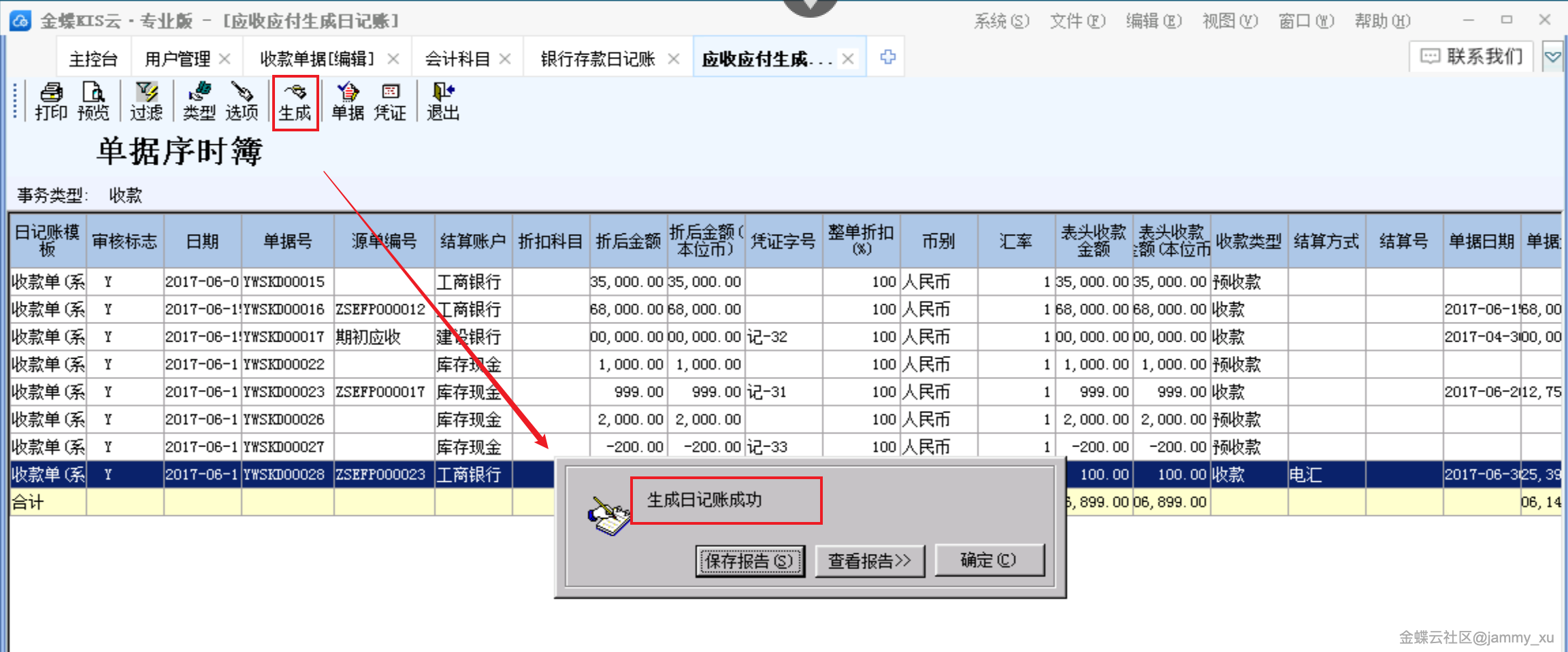 第②步:進入應(yīng)收應(yīng)付--應(yīng)收應(yīng)付生成日記賬功能,選擇收款單,進入即可看到收款單A,選中收款單A,點擊生成,完成收款單生成日記賬。