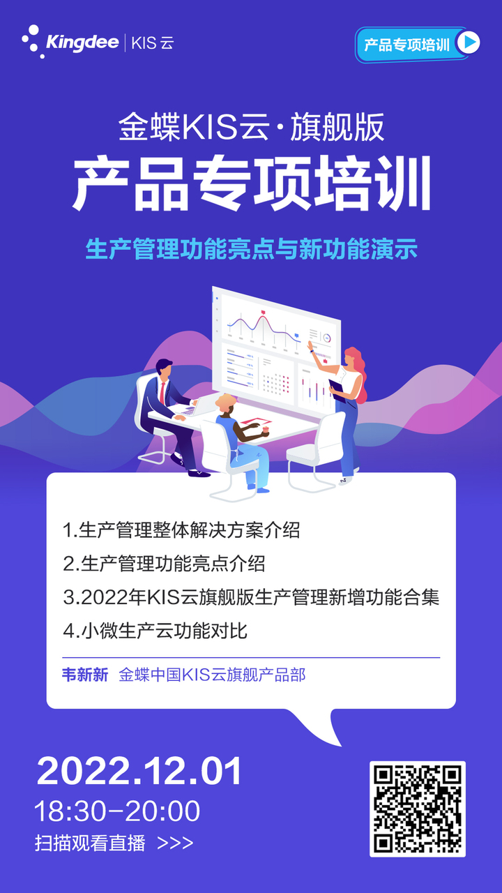 可通過掃描海報二維碼預(yù)約觀看直播 KIS云·旗艦版生產(chǎn)管理功能亮點(diǎn)與新功能介紹