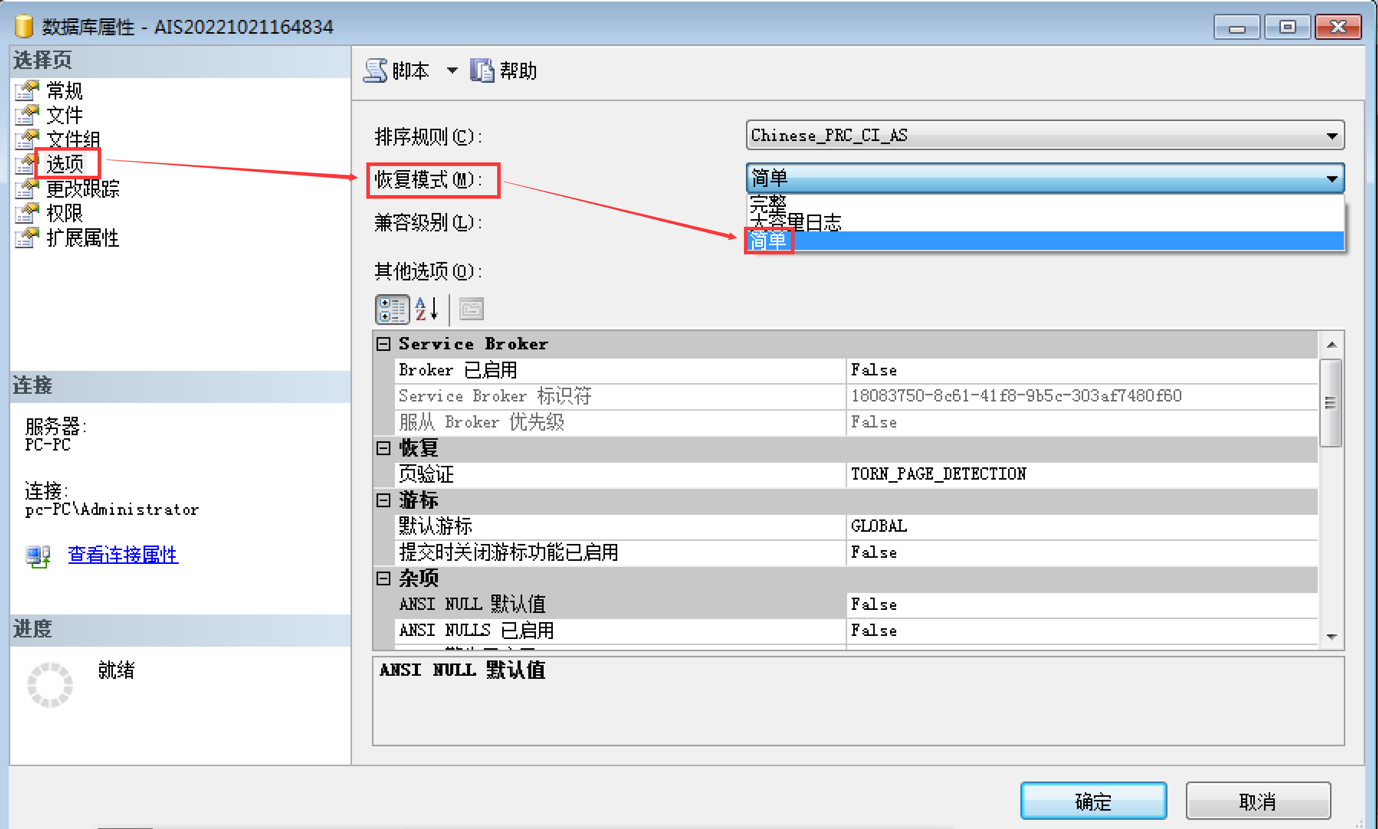 登錄SQL數(shù)據(jù)庫(kù)——選中 問(wèn)題賬套——鼠標(biāo)右鍵【屬性】——彈出【數(shù)據(jù)庫(kù)屬性 框】——選項(xiàng)——恢復(fù)模式——簡(jiǎn)單。