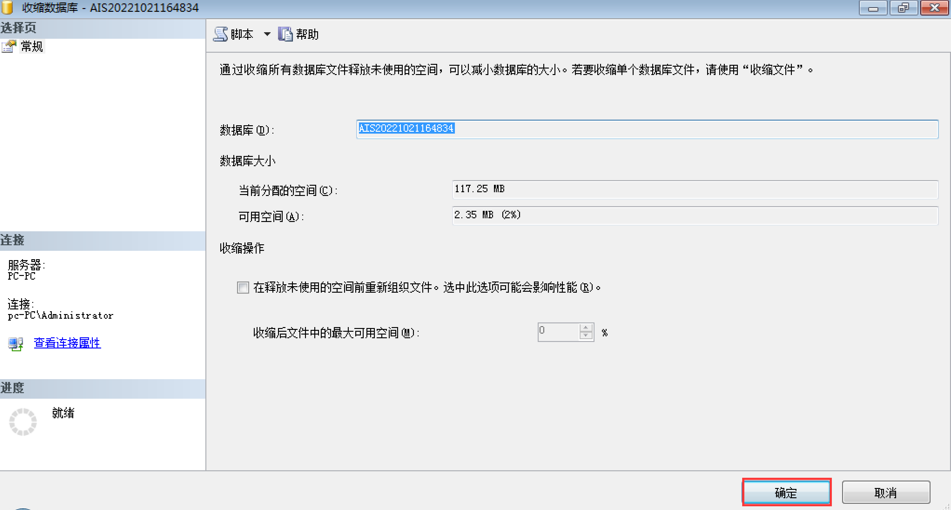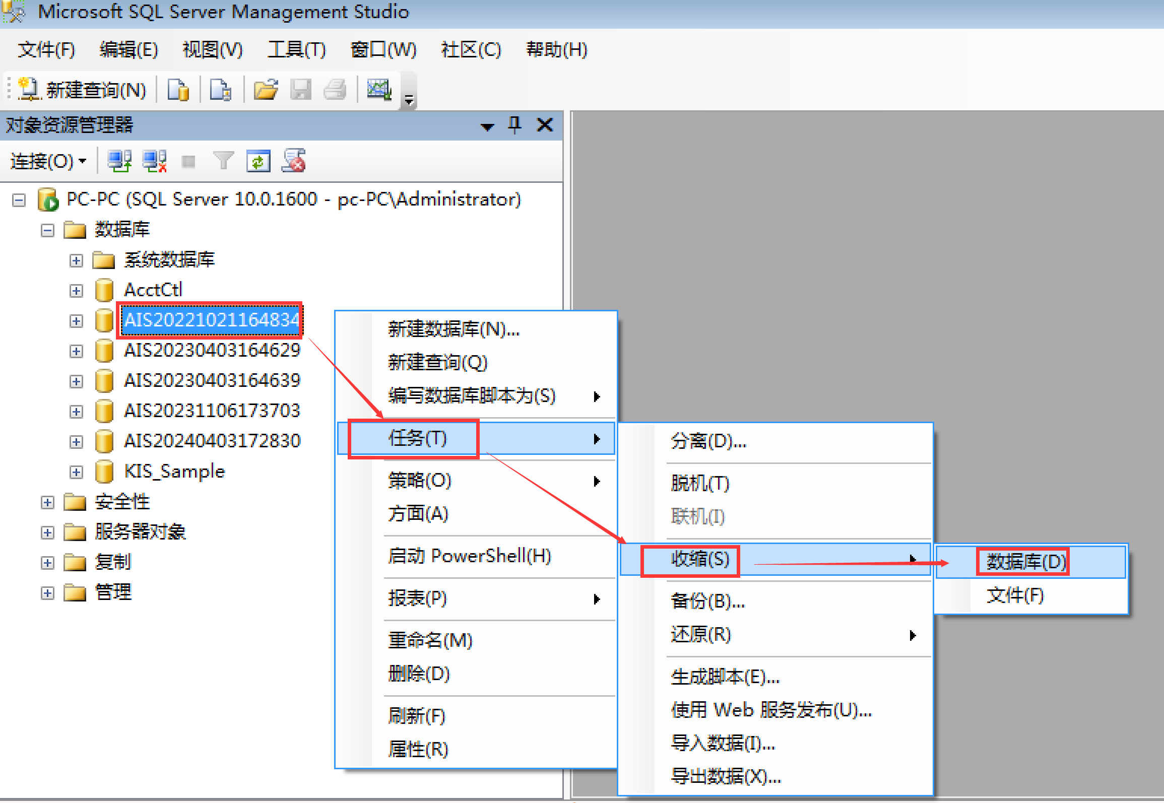 選中 問(wèn)題賬套——鼠標(biāo)右鍵【任務(wù)】——【收縮】——【數(shù)據(jù)庫(kù)】——確定。